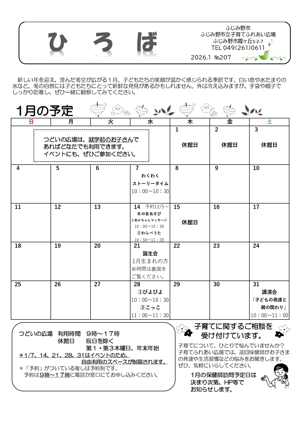 1月ひろば通信(スケジュール、イベントの紹介)、保健師訪問日について
