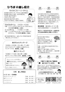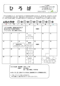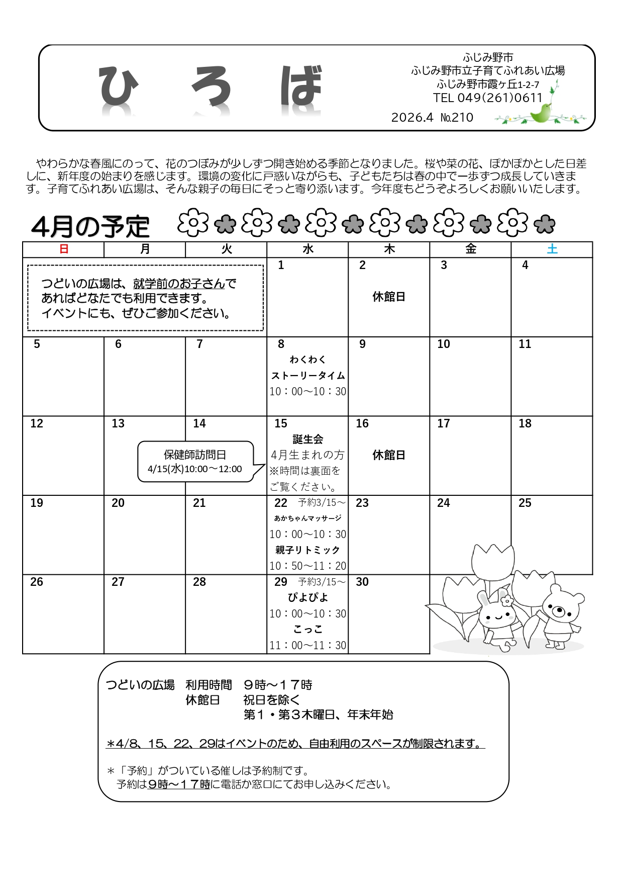 4月の保健師訪問日は 4/15(水)10:00~12:00 です。 お子さまの発達や生活習慣など、 保健師に相談したいことがございましたら、 どうぞお気軽にお越しください。 ————————————— 4月のひろば通信です。 (※クリックで拡大できます)